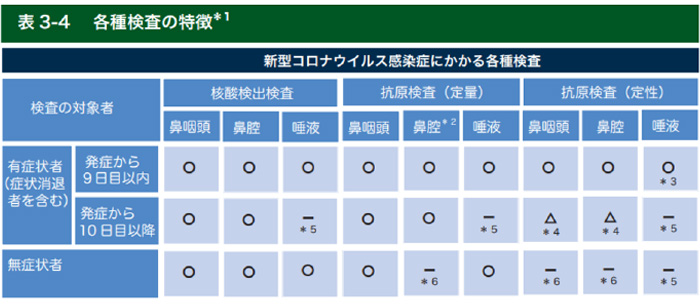 ※6:確定診断としての使用は推奨されないが、感染拡大地域の医療機関や高齢者施設等において幅広く検査を実施する際にスクリーニングに使用することは可能。ただし、結果が陰性の場合でも感染予防策を継続すること、また、結果が陽性の場合であって医師が必要と認めれば核酸検出検査や抗原定量検査により確認すること。